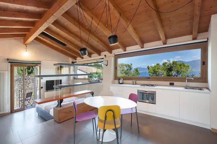 Cucina attrezzata, TV, aria condizionata, piscina. Vista lago dall'ultimo piano.