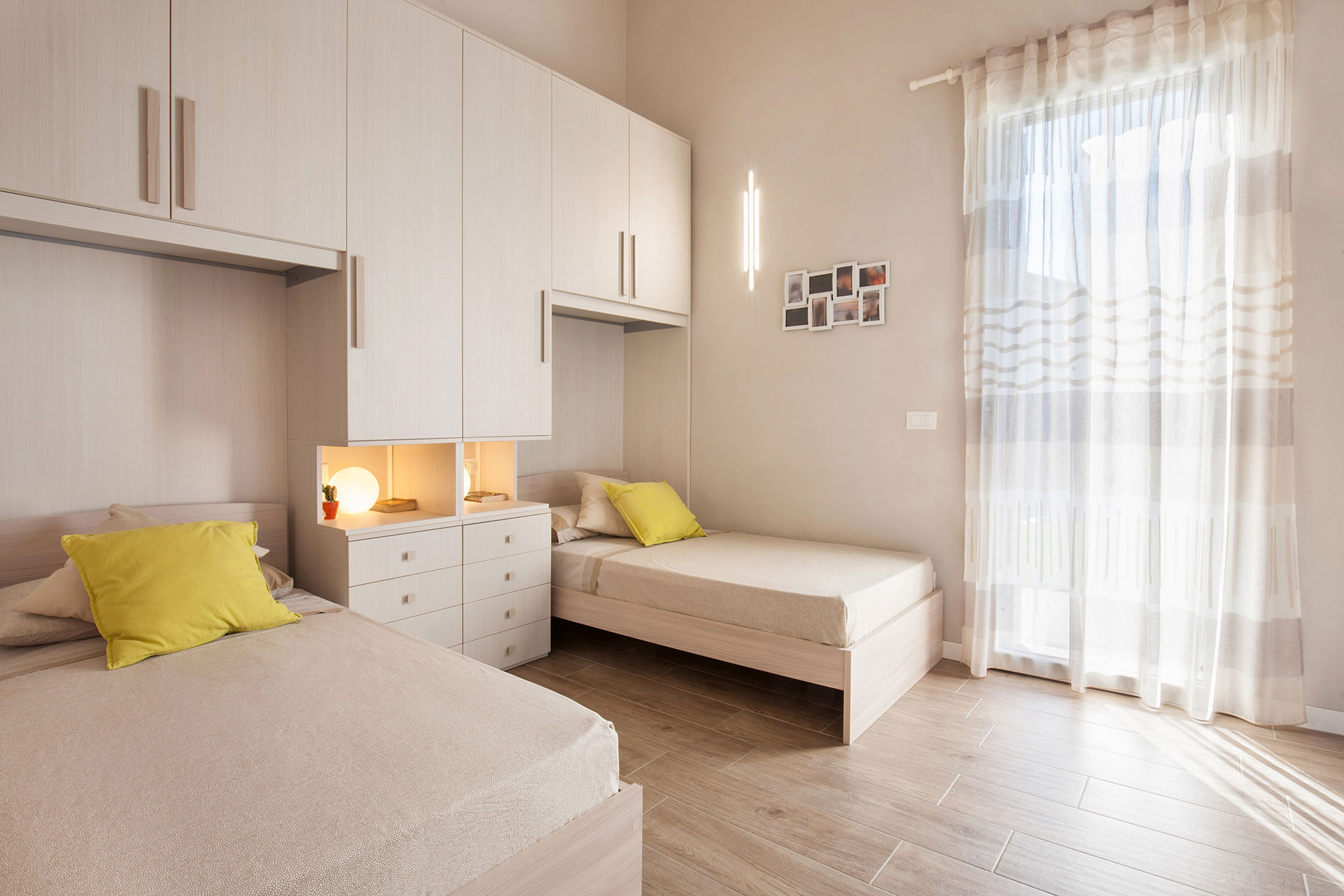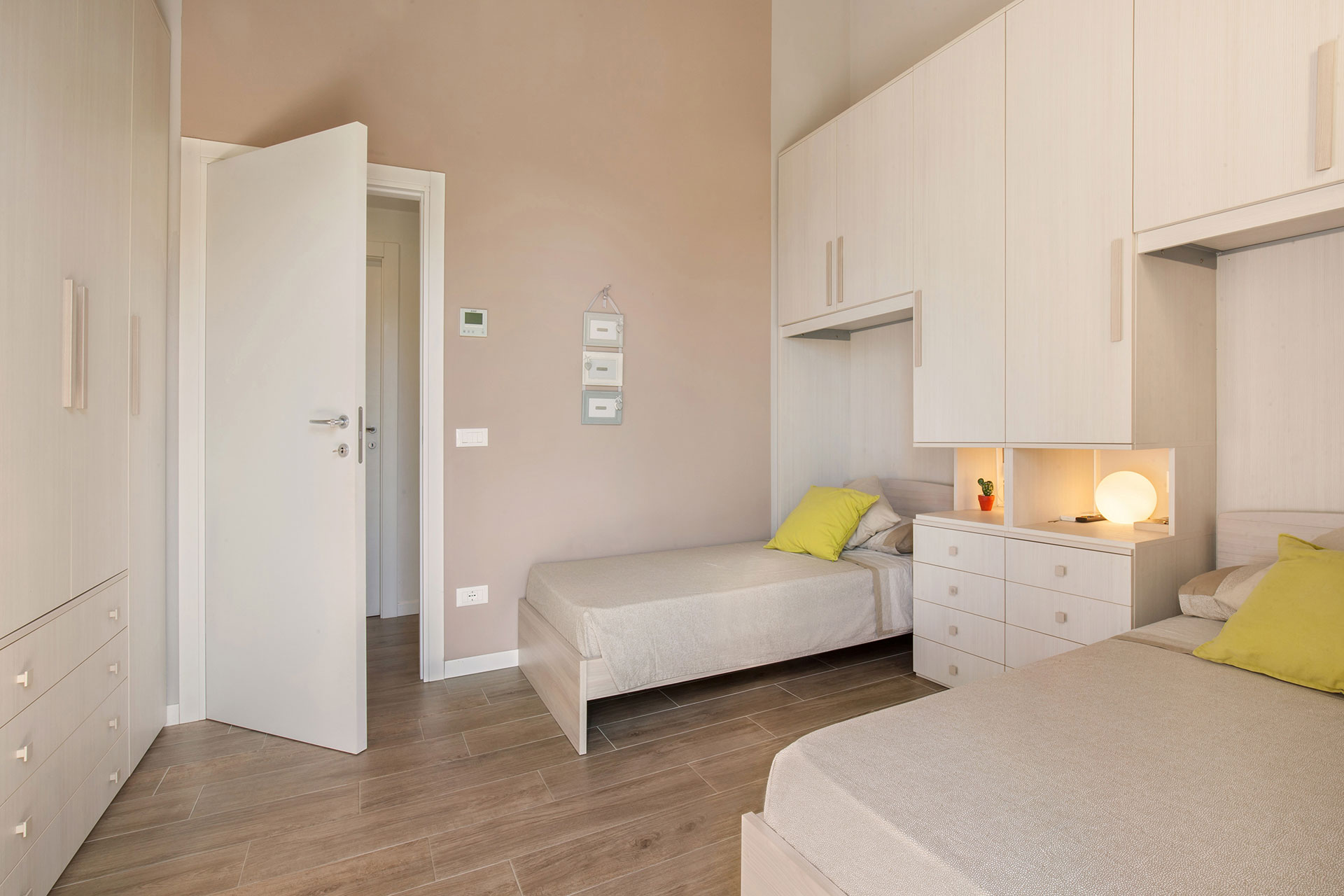 La zona notte comprende due spaziose camere matrimoniali e una camera singola, tutte con vista sul giardino e dotate di pratici armadi a muro, offrendo spazio e privacy per ogni membro della famiglia. Completano questa zona due bagni dal design minimalista, rifiniti con sanitari di alta qualità e pavimentazioni in gres porcellanato.